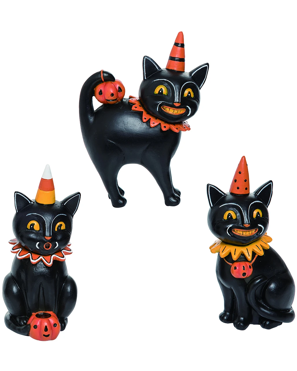 Was für ein niedliches Kätzchen! Und wie hübsch sie sich gemacht hat mit ihrem Kragen und dem Hut. Die Johanna Parker Kürbis Katze DekofigurFigur ist eine fantastische Halloween Deko für Retro Fans. Die niedliche Jack O’Lantern Katzen Figur ist liebevoll bemalt worden und zwar von Hand, so dass jede dieser entzückenden Halloween Vintage Katzen ein absolutes Unikat ist. Stelle die gut gelaunte Mieze als Tischdekoration auf und freue dich auf die Gruselnacht.