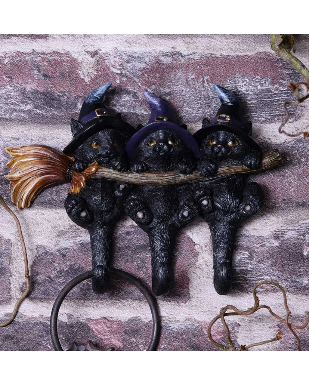 Als treuer Begleiter von Hexen und Magiern sorgen niedliche Kätzchen für jede Menge Spaß und Magie. Da ist es selbstverständlich, dass sich Katzen Wohndeko vor allem bei Hexen Fans durchgesetzt hat. Unsere 3 Kätzchen mit Hexenhut als Schlüsselbrett sind die perfekte Gothic Deko für Fans der Magie! Das Schlüsselboard zeigt 3 schwarze Katzen mit Hexenhut, die sich Seite an Seite, an einem Hexenbesen festhaltend. Ihre Schwänzchen dienen dabei als Schlüsselaufhängung.