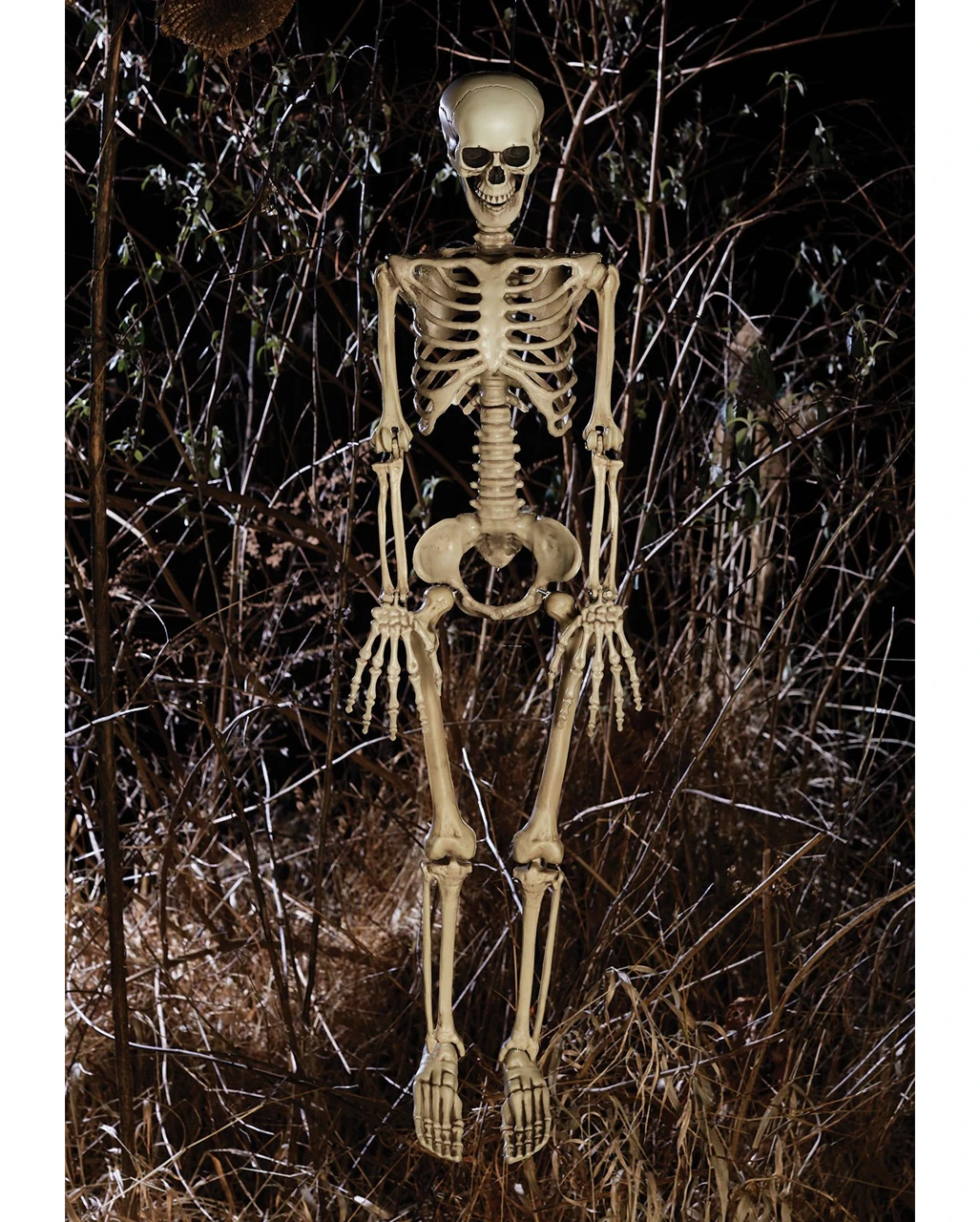 Positioniere das schaurige Knochengerippe mit beweglichen Gelenken als Halloween Deko Figur