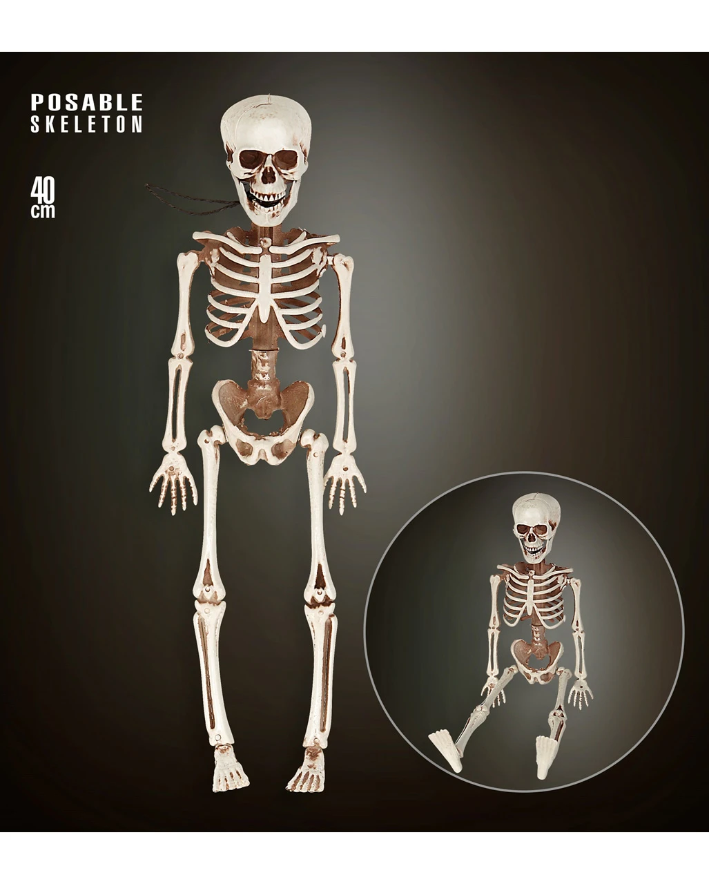 Unser bewegliches Skelett Gerippe ist 40 cm groß und besteht aus Kunststoff. Die Skelett Deko sieht sehr realistisch aus und lässt sich ohne großen Aufwand positionieren! Beine, Arme und Schädel des Gerippes sind beweglich, was dir flexible Positionen ermöglicht. Entdecke auch den Knochengerippe Flaschenhalter als Gruseldeko am Halloween Buffet!
