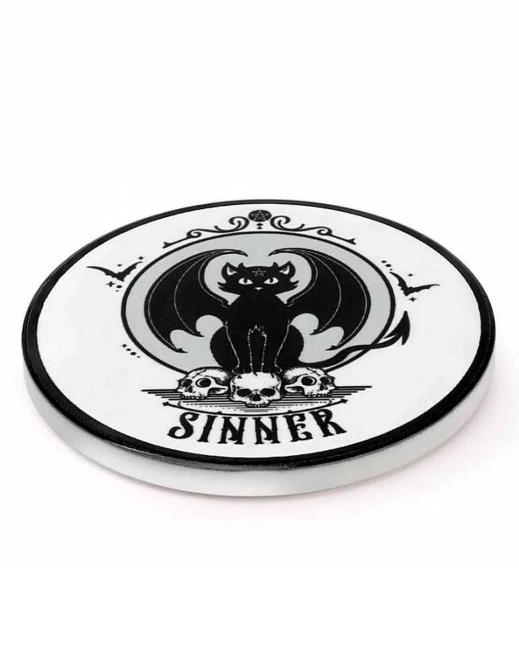 Der Fledermaus Katze Untersetzter ist Schwarzweiß und zeigt eine geflügelte Katze mit Totenschädeln. Darunter ist der Schriftzug „Sinner“ zu lesen. Der Untersetzter besteht aus Keramik und hat eine rutschfeste Korkrückseite. So hat er guten Halt auf jeder Oberfläche. Entdecke auch unsere Mystische Katzenfigur mit Fledermaus Flügel 24cm
