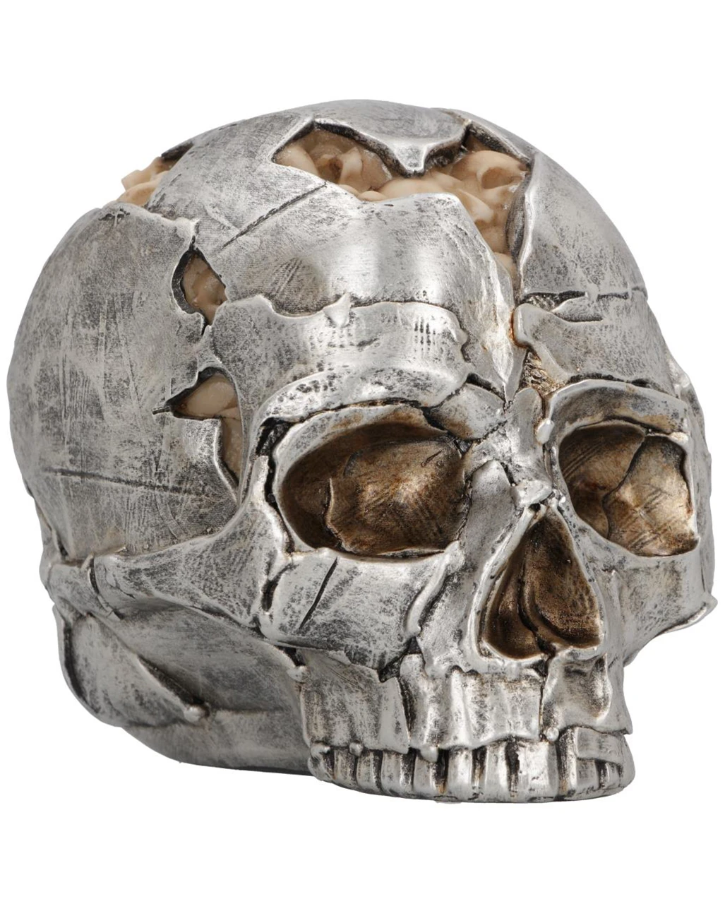 Cooler, aus Metallfetzen geformter Totenschädel. In den aufgeplatzten Rissen erscheinen zum Teil kleinere Schädel, die sich auf der Schädeldecke gebildet haben und einen Gehirn-Effekt erzeugen.
