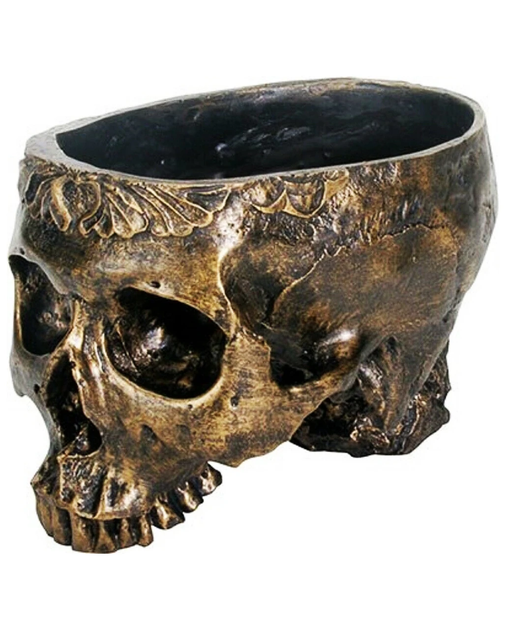 Du hast einen grünen Daumen und wünschst dir einen Gothic Blumentopf im Totenschädel Look? Dann ist unsere goldene Totenschädel Pflanzenschale wie für dich gemacht. Sie bietet deinen Grünpflanzen ein stilvolles Zuhause und setzt deine Lieblinge perfekt in Szene. Der Totenkopf sieht mit seiner gold-schwarzen Bemalung besonders antik aus. Auf dem Esstisch oder auf dem Fenstersims kommt die goldene Totenschädel Pflanzenschale perfekt zur Geltung. Als Gothic Wohnaccessoire und Geschenkidee liegst du mit dem Totenschädel Blumentopf goldrichtig!