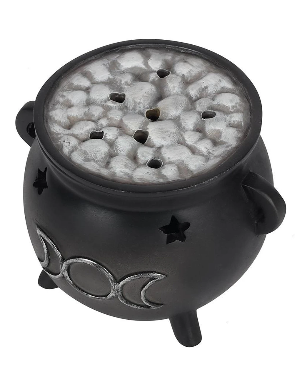 Der Hexenkessel mit Dreifach-Mond Räucherkegel Halter ist ein dekorativer Blickfang auf jedem Tisch. Akzentuiert durch ausgestanzte Sterne und dem geschnitzten Triple Mond mit Silber-Effekt mit abnehmbarem, „blubbernden“ Brühaufsatz, ist der Halter für Rauchwerk eine extravagante Halloween Partydeko.