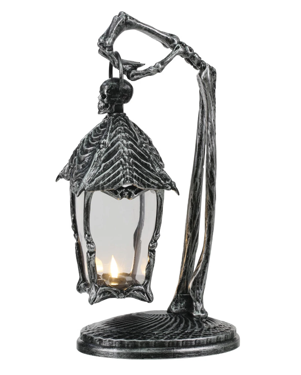 Mit deinem Skelett Hand Stimmungslicht wird sorgst du für unheimliches Flair in deinem Zimmer. Die Skelett Hand Laterne für Halloween besteht aus einem Sockel, aus dem ein knöcherner Arm empor ragt. Der Knochen Arm hält eine Laterne, die ebenfalls aus Knochen besteht und mit einem kleinen Totenkopf akzentuiert ist. Im Inneren befindet sich ein LED-Licht, das mit Batterien zum Leuchten gebracht wird.