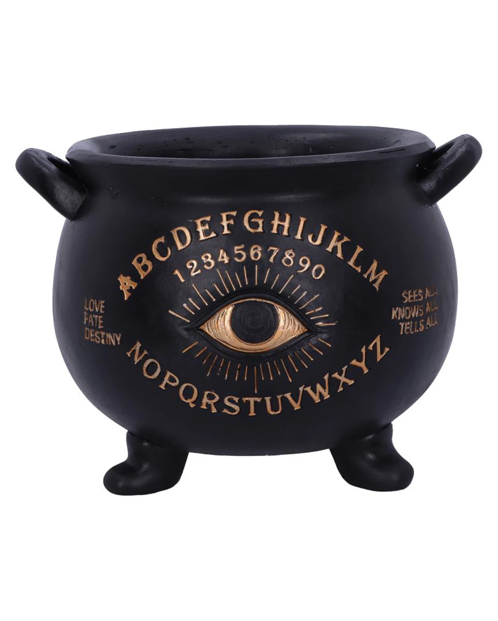 Der Hexenkessel im Ouija Design besitzt eine mattschwarze Oberfläche und verfügt über ein goldenes Auge in der Mitte. Das Dekoelement trägt die Worte „Love, Fate, Destiny“ und „Sees all, Knows all, Tells all“, die das Auge flankieren. Gegossen aus feinstem Kunststein, ist dieser schwarze Hexenkessel die perfekte Ergänzung für dein alternatives Wohndesign. Entdecke auch unseren Schwarzer Totenschädel Duftöl Teelichthalter und die Fate Schmuck & Zubehör Schale KILLSTAR